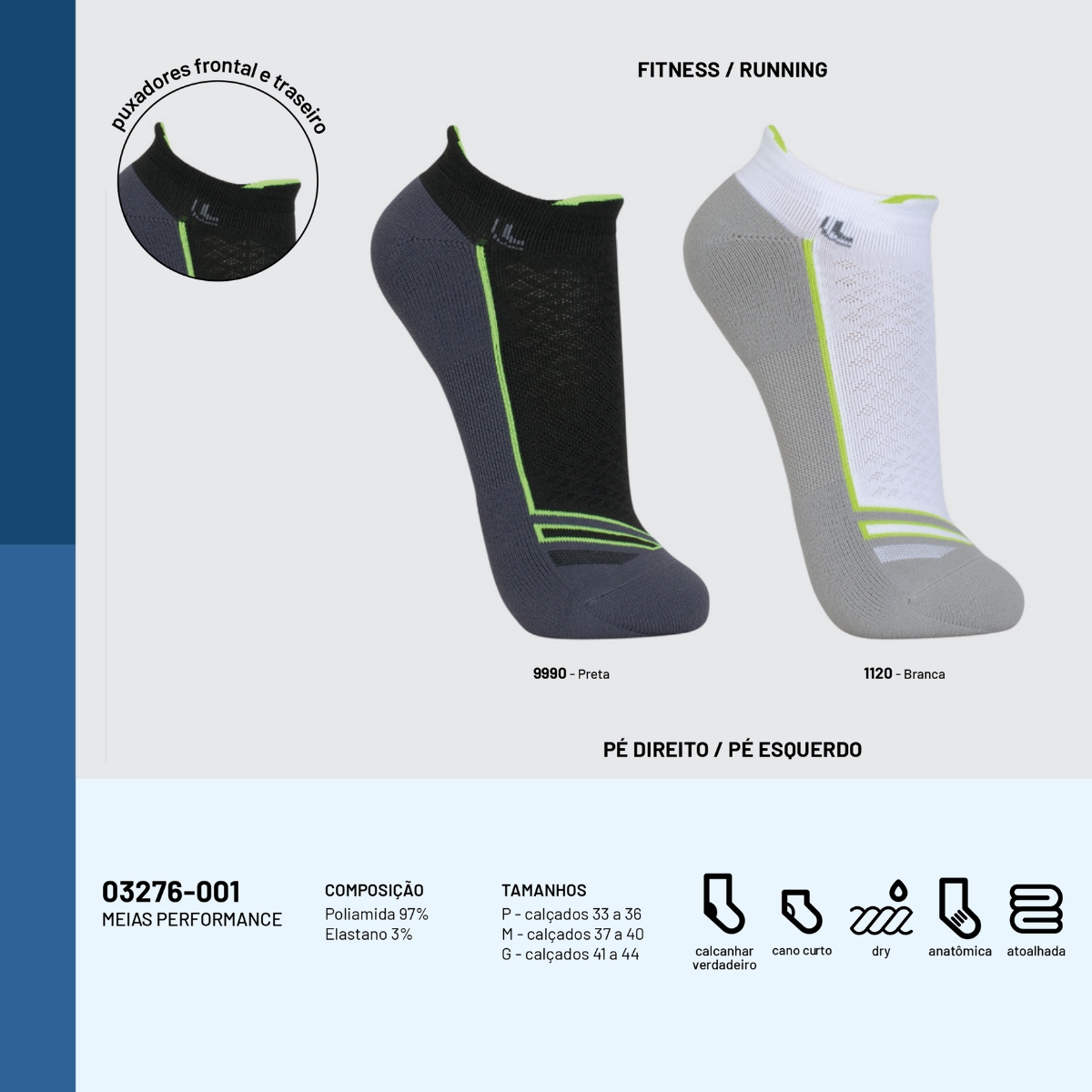 Com estrutura anatômica e modelagem para pé direito e esquerdo, oferece encaixe preciso e calcanhar verdadeiro, garantindo alta estabilidade nos movimentos e reduzindo o risco de escorregamentos ou torções. O puxador traseiro facilita o calce e mantém a meia sempre posicionada, evitando que deslize para dentro do calçado.