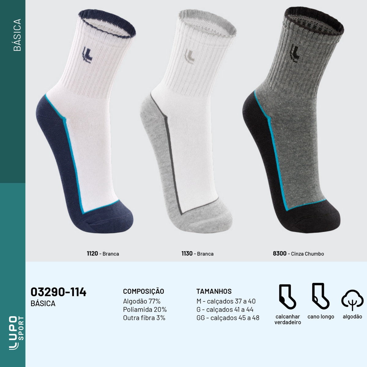 A meia básica de cano longo e calcanhar verdadeiro é confeccionada com algodão penteado, um material leve, macio e suave, que passa por um processo de eliminação de fibras curtas e impurezas para garantir toque superior e durabilidade.